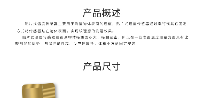 簡要描述:貼片式溫度傳感器主要用于測量物體表面的溫度,貼片式溫度傳感器通過螺釘或其它固定方式將傳感器貼在物體表面,實現較理想的測溫效果。