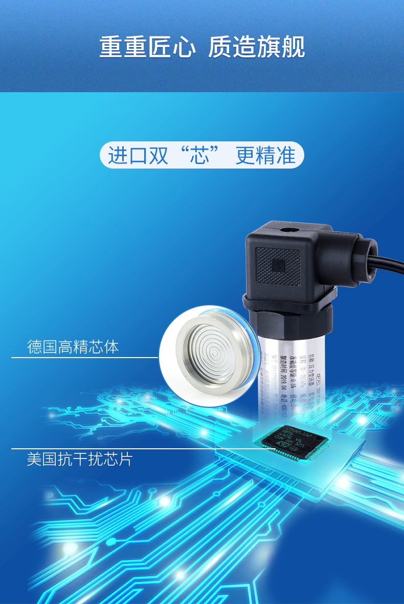 簡要描述:擴散硅壓力變送器選用進口高精度、高穩定性壓力 敏感芯片。敏感芯片采用先進的微機械刻蝕加工工藝, 通過在硅片上擴散四個高精度電阻,從而形成惠斯通電 橋。